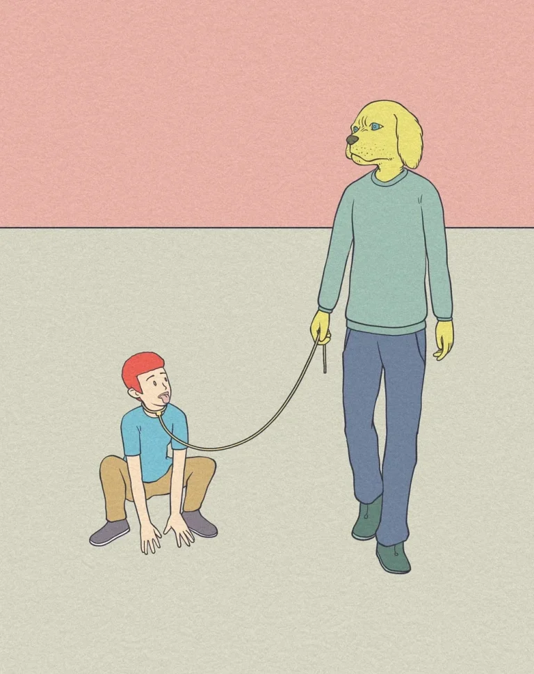 Ich wurde von einem Raumschiff entführt, dessen Crew sich als Hunde entpuppten. An Bord ihres Raumschiffs trugen alle anderen Menschen ein Halsband – auch ich bekam eines angelegt. Wir flogen zu einem fremden Planeten, wo wir sahen, wie Hunde ihre menschlichen Begleiter an der Leine führten und sie in kleine Häuschen brachten. Mein eigenes 'Häuschen' war spartanisch: ein Bett, ein Tisch, ein Teller, ein Becher. Und sonst... nichts!